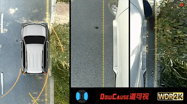 有時(shí)車主需要把車停在離路崖非常近的地方,但是又擔(dān)心輪胎會(huì)刮,在倒檔時(shí),再次打開雙閃燈,道可視360°全景畫面會(huì)自動(dòng)進(jìn)入??柯费履J?,車主可以非常清楚和直觀地看到車身和路崖之間的距離。